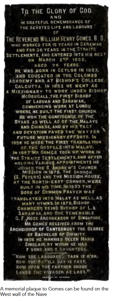 We are grateful for the ministry of Revd William Gomes, who came from Ceylon to serve in Malaya in the late nineteenth century. He learned several local languages and brought the Gospel to the Dayaks and Malays. He also helped establish and nurture many non-English-speaking congregations within our Anglican Church during that period. A commemorative plaque honouring his ministry is located near the entrance to the nave of the St Andrew’s Cathedral.